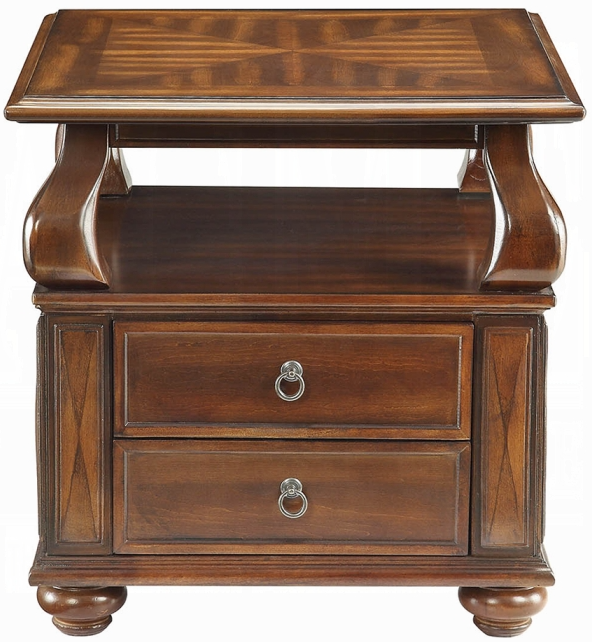 The Amado end table with stylish transitional design will be a great addition for your living room. Constructed with selected woods and veneers in warm walnut finish, features two drawers, and open storage compartment, it is complemented by wooden round bun legs.Read More