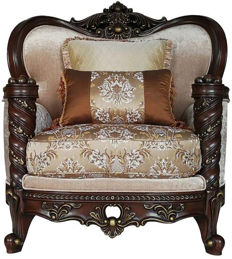Carved Crown, Molding Trim with Welt Trim: Contrast gold-brush accent, rubber wood (front armrest, leg and base)