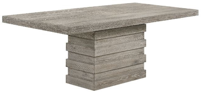 Impress all your guests during your next dinner party with this Faustine dining collection. The dining table strikes a clean-lined silhouette and boasts a single pedestal base for a contemporary style touch. It is a salvaged light oak finish that is versatile enough to blend with nearly any color palette.Read More