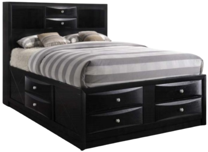 Features: Wooden frame bed, bookcase headboard, storage footboard and rails: 8 drawers: headboard with 2 drawer, side rail with 1drawer each side, footboard with 4 drawer