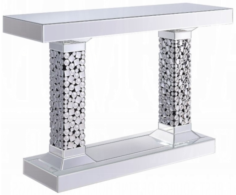The table features tempered glass and a fully mirrored frame with mirror base with columns encrusted with a spectacular faux gem inlay. This beautiful accent table will modernize any space you place it.