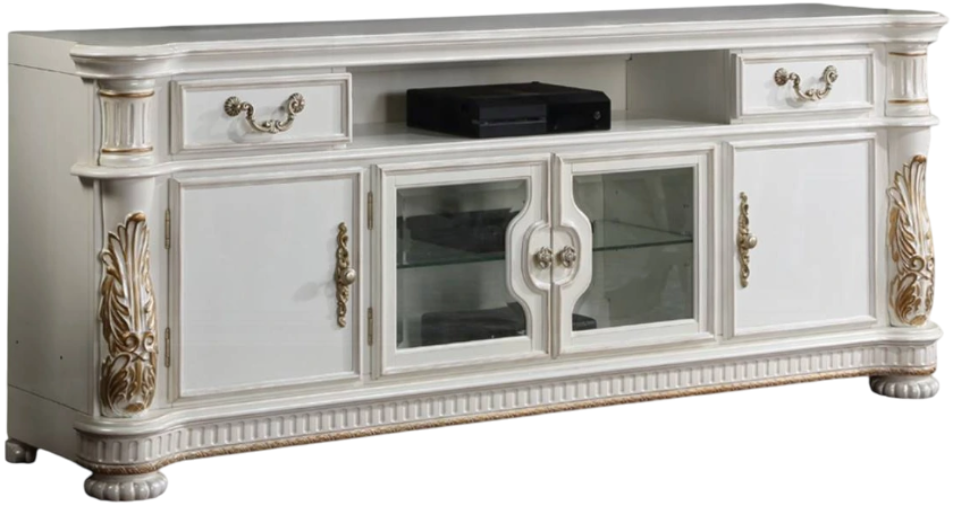 The TV stand also features storage and media cable management, keeping your wires organized and out of sight. Crafted with attention to detail, this entertainment center boasts a classic design with a touch of elegance. The antique pearl finish with gold accents exudes sophistication, while the crown molding adds a touch of luxury to the overall look. This piece is sure to complement any decor style, from traditional to contemporary. The entertainment center is sold separately.