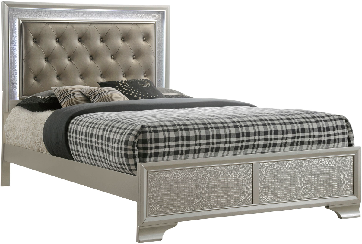 Crown Mark Lyssa Queen Upholstered Crocodile Pattern Panel Bed This glamorous bedroom collection features an embossed crocodile finish, decorative knob hardware and contemporary clean lines. Make a bold statement by incorporating this stunning piece into your home.Read More