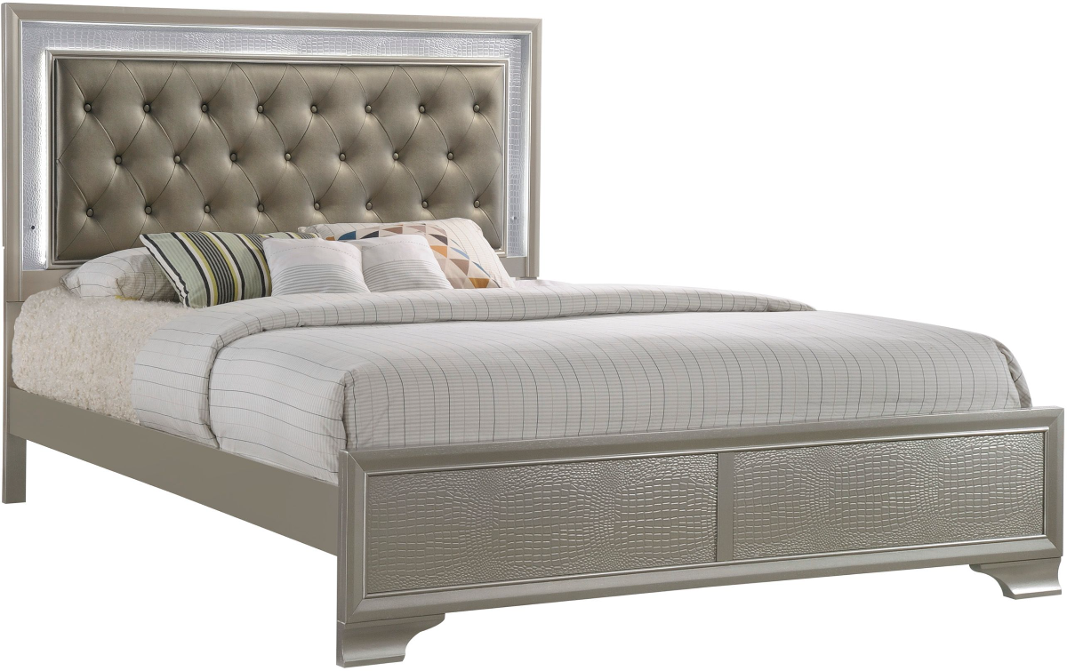 Crown Mark Lyssa King Upholstered Crocodile Pattern Panel Bed This glamorous bedroom collection features an embossed crocodile finish, decorative knob hardware and contemporary clean lines. Make a bold statement by incorporating this stunning piece into your home.Read More