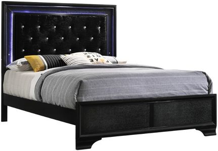 Crown Mark's Micah Queen Bed features a LED backlight headboard panel. This upholstered headboard has a button tufting detail and is durable and easy to clean. The bed frame is available in a modern black finish.Read More