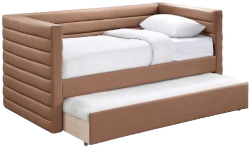Enjoy added sleeping space with the addition of this Beverly cognac vegan leather twin daybed. It's upholstered with soft premium vegan leather, it's water-resistant and anti-scratch. Featuring deep channel tufting for comfort and style, the daybed includes a twin trundle with a rolling design for up to an 8" thick mattress.Read More