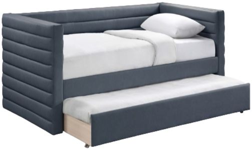Enjoy added sleeping space with the addition of this Beverly navy vegan leather twin daybed. It's upholstered with soft premium vegan leather, it's water-resistant and anti-scratch. Featuring deep channel tufting for comfort and style, the daybed includes a twin trundle with a rolling design for up to an 8" thick mattress.Read More