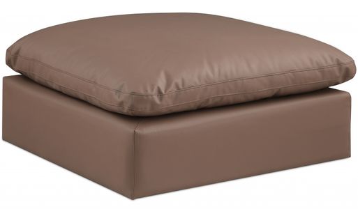 Wrapped in rich brown durable vegan leathered upholstery, this ottoman offers a plush embrace of overstuffed down feather cushions, carefully crafted to deliver the highest level of comfort. The perfect seat for creating an oasis for relaxation, this ottoman has thick foam surrounding its frame for added support and coziness.