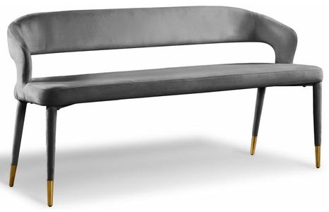 A rounded, open back provides additional comfort as well as style. Gold-tipped upholstered legs give this bench an extra touch of style that complements any contemporary living space. Its long length guarantees that you'll always have extra space to seat family and friends who visit.
