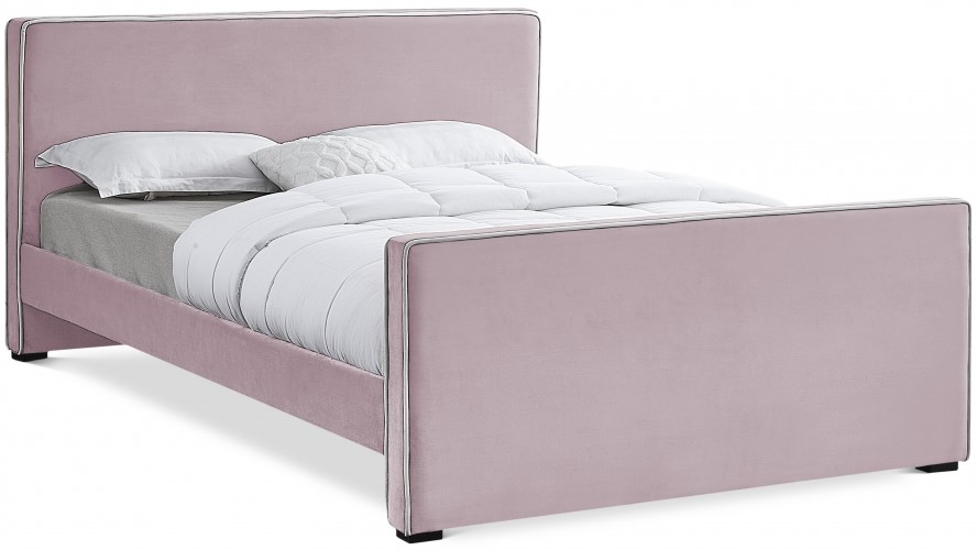 Lend your bedroom an elegant look with this Dillard velvet bed. Live out your velvet fantasy with this bed's soft pink velvet upholstery that runs the full length of the bed from headboard to footboard and is trimmed with velvet piping in a contrasting color for a contemporary vibe.Read More