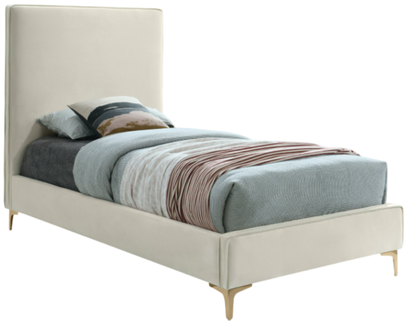 Provide yourself with a few options when you choose the sleek Geri cream velvet twin size bed. The headboard, side rails and footboard are all cushioned and upholstered, with snazzy decorative piping on the headboard and footboard. This bed comes with two different sets of legs so you can match your other decor.Read More