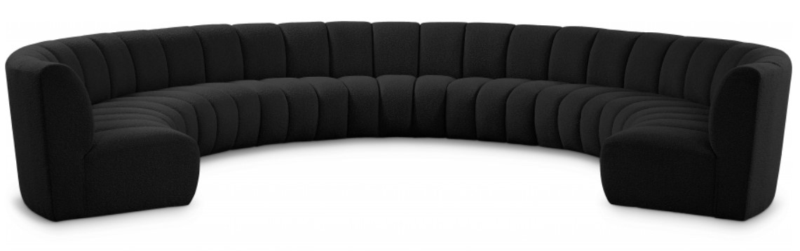 Elegant and eye-catching, the stunning black boucle fabric Infinity nine-piece. Modular Sectional from Meridian Furniture is the perfect addition to any space The deep channel tufting adds a touch of sophistication to the sectional, making it a statement piece that will elevate any decor.Read More