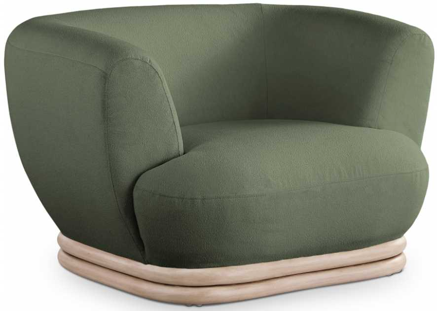 Featuring a rubber wood frame upholstered with rich green boucle fabric this chair is both soft and comfortable to kick back and relax in. Its solid rubber wood base in a natural oak finish provides a splash of color to this black piece.Read More