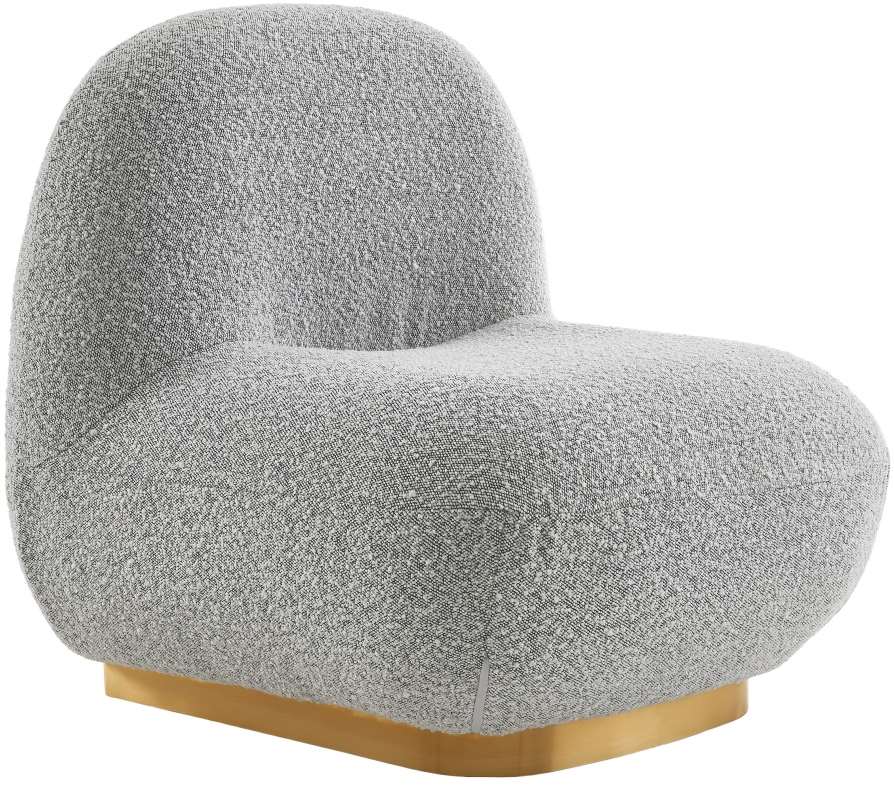 Add a simple yet eye-catching touch to your home with this Liam accent chair. Upholstered with grey boucle fabric and featuring a brushed gold metal base, this simplistic accent chair is both comfortable and stylish.Read More
