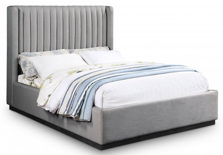 Soft rich grey linen fabric covers the back and sides of this wingback bed, giving it an ultra modern feel. A solid finished wood base provides ample support for lasting performance and durability.