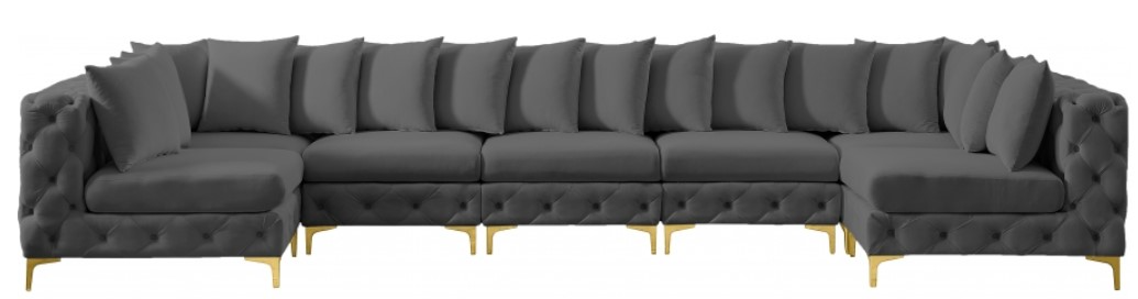 Lean back and relax on this Tremblay sectional. Featuring soft grey velvet upholstery with deep button tufting, this sectional adds a bold touch to any living space. A complete set of gold and chrome legs are included, so you can change it up to suit your home décor.Read More