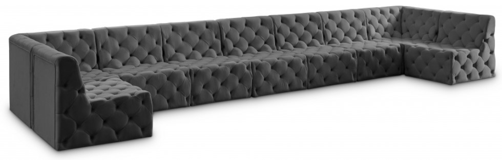 The grey velvet Tuft modular sectional from Meridian Furniture is a sofa composed of separate modules that can be arranged in different configurations to fit your living space. The sofa is upholstered in a soft grey velvet fabric and features deep button tufting, giving it a classic and elegant look.Read More